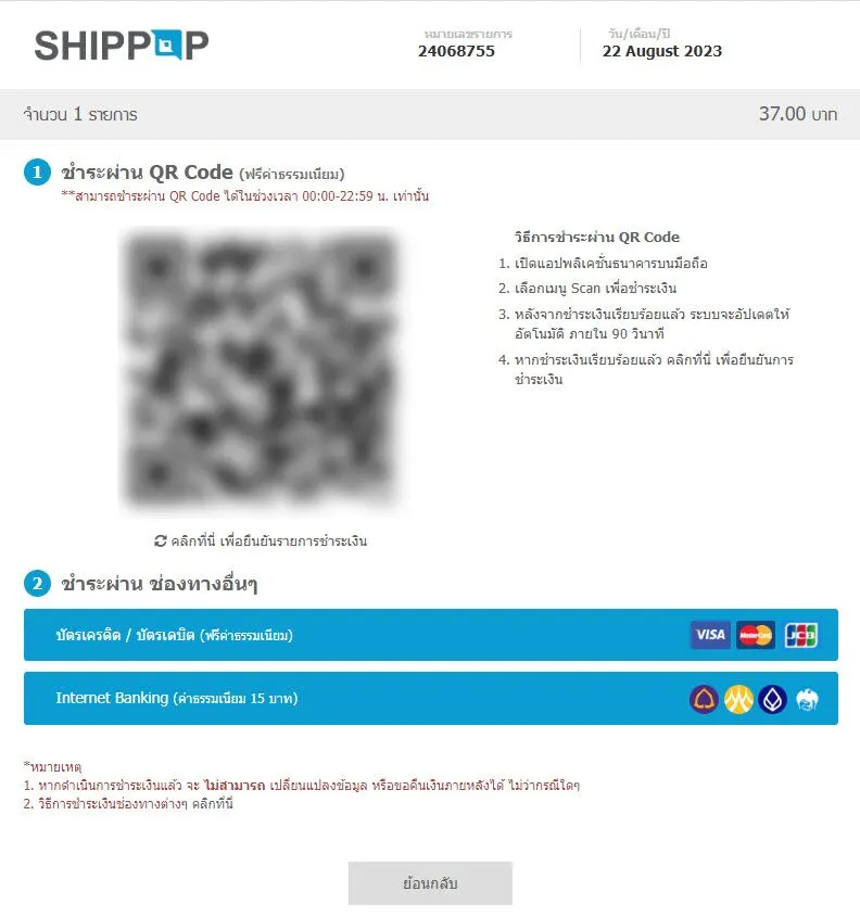 9. เมื่อกดยืนยัน ระบบจะมาที่หน้าชำระเงินค่าส่ง ให้ตรวจสอบรายละเอียด และติ๊ก “ข้าพเจ้ายอมรับเงื่อนไขการให้บริการ และ ความเป็นส่วนตัว”