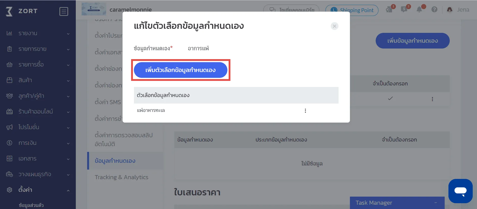 1. ไปที่เมนูตั้งค่า > เลือก บริษัทร้านค้า > เลือก ข้อมูลกำหนดเอง