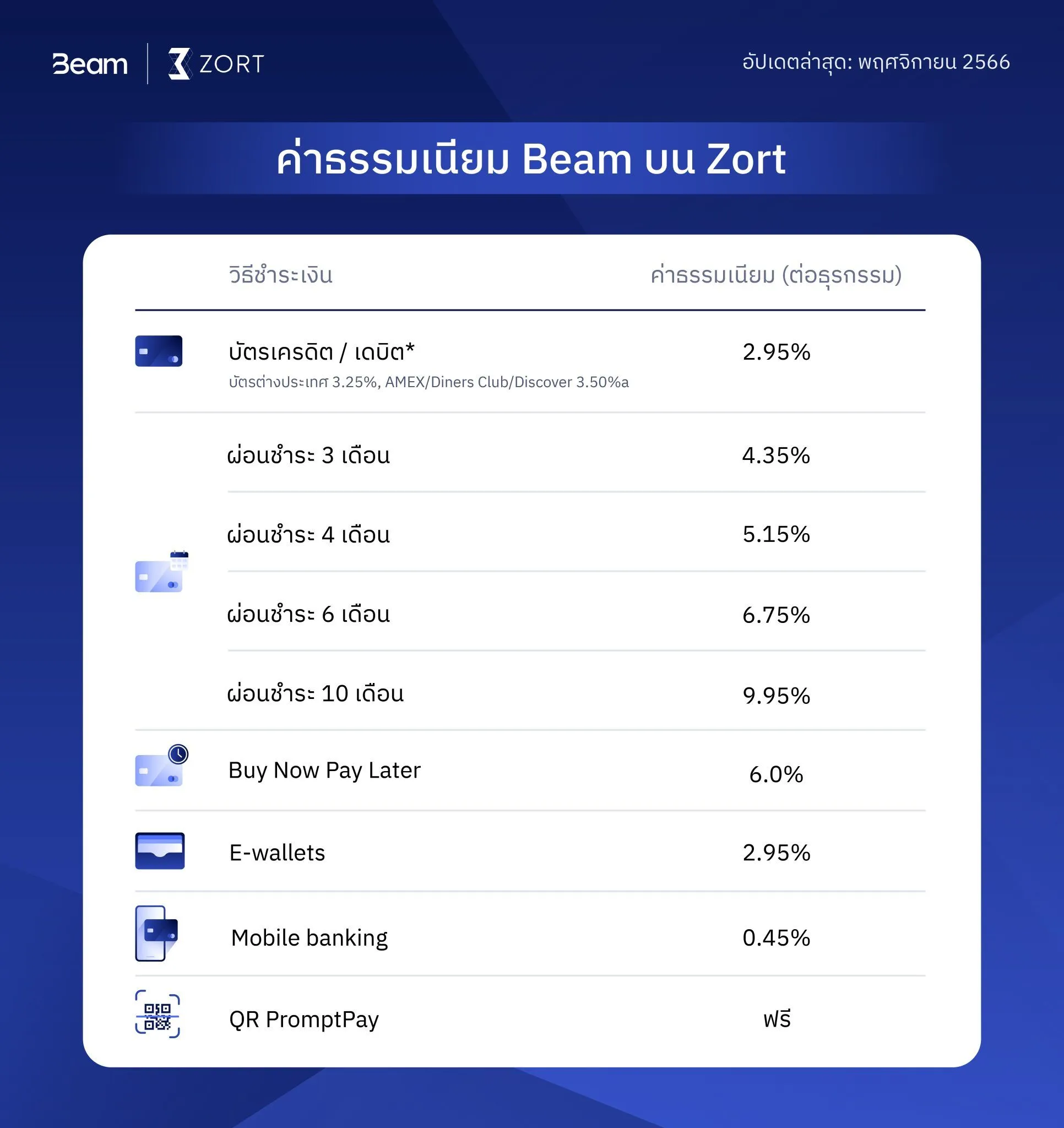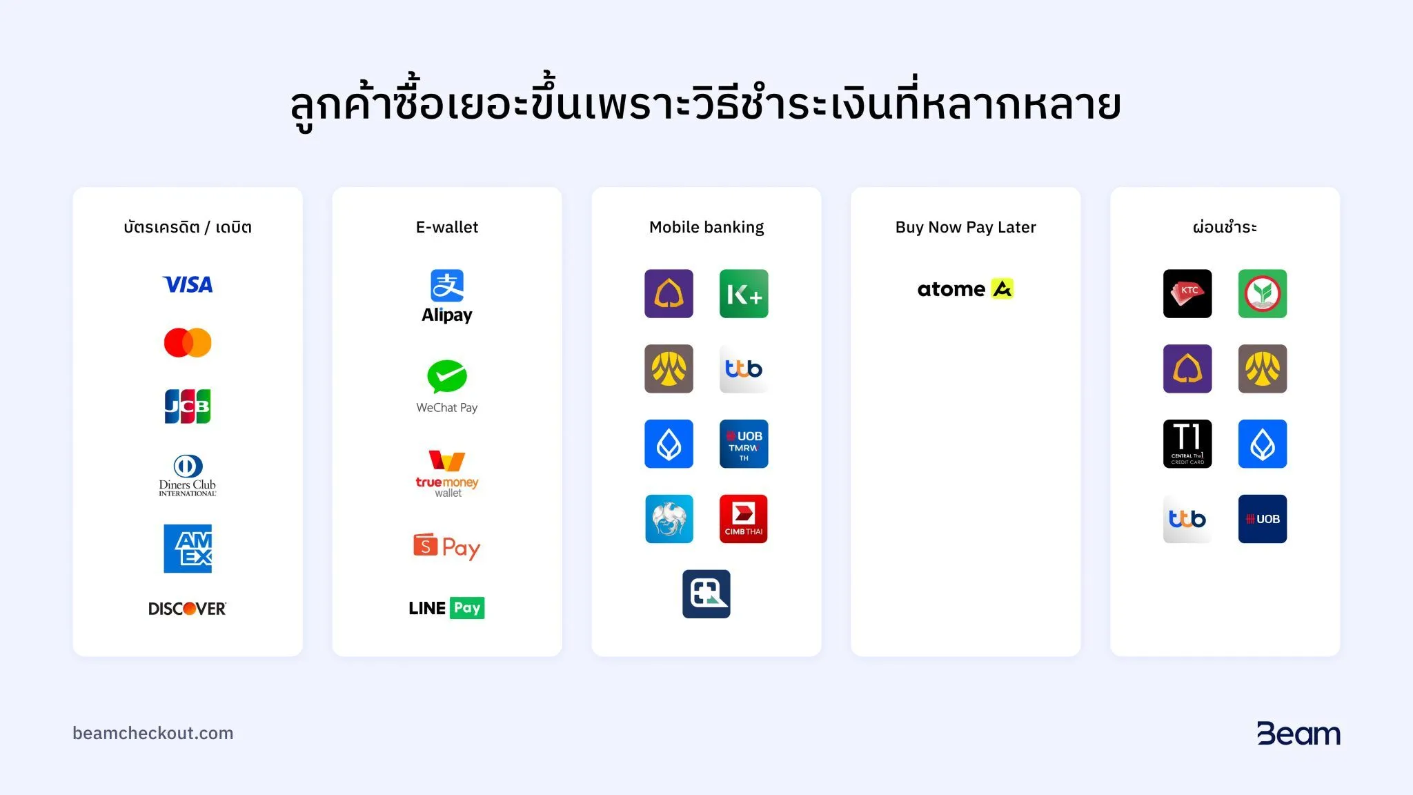 Beam มีวิธีการชำระเงินที่หลากหลาย โดยสามารถดูค่าธรรมเนียมของแต่ละวิธีการชำระเงินได้จากรูปด้านล่าง
