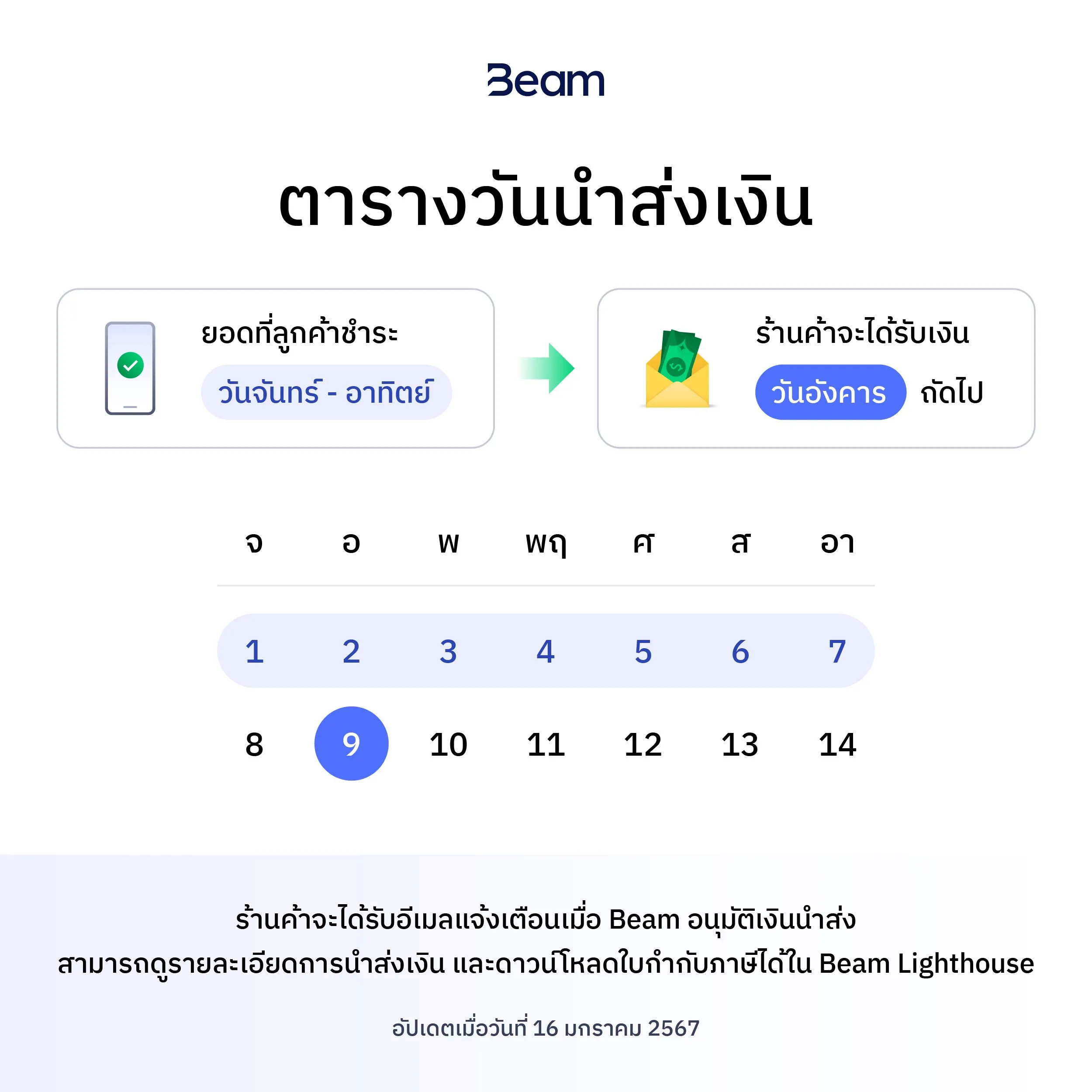 ร้านค้าจะได้รับอีเมลแจ้งเตือนเกี่ยวกับเอกสารแสดงธุรกรรมการชำระเงิน (Transaction report) และใบเสร็จ/ใบกำกับภาษี (Receipt/Tax invoice) ของแต่ละรอบบิลทางอีเมล แต่หากต้องการดาวน์โหลดไฟล์ สามารถเข้าไปดาวน์โหลดได้ใน Beam Lighthouse โดยสามารถดูรายละเอียดตารางการนำส่งเงินได้จากรูปด้านล่าง