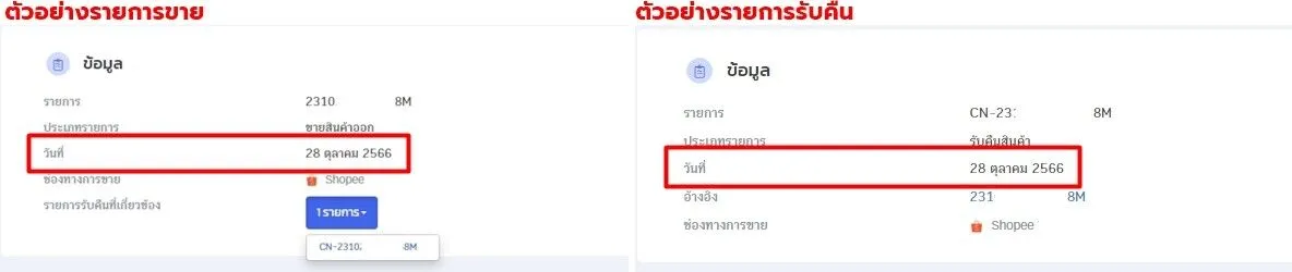 1. รายการรับคืนรูปแบบเดิม : รายการจาก Marketplace วันที่รายการขาย และวันที่รายการรับคืน จะเป็นวันที่เดียวกัน เช่น