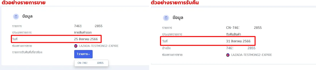 2. รายการรับคืนรูปแบบใหม่ : รายการจาก Marketplace วันที่รายการขาย และวันที่รายการรับคืน จะต่างกัน โดยวันที่รายการรับคืน จะเป็นวันที่ที่สร้างรายการรับคืนใน Marketplace เช่น