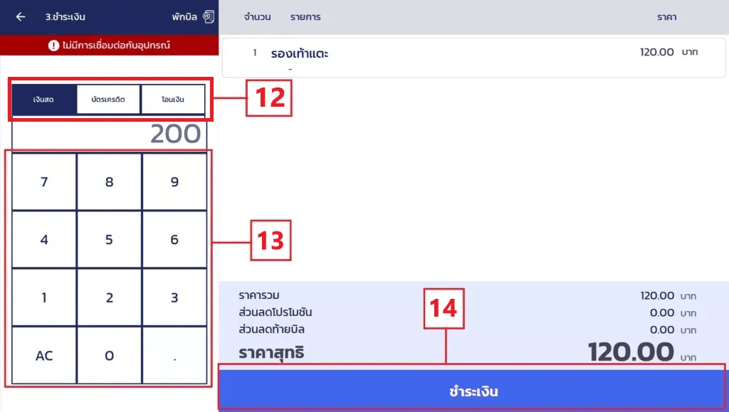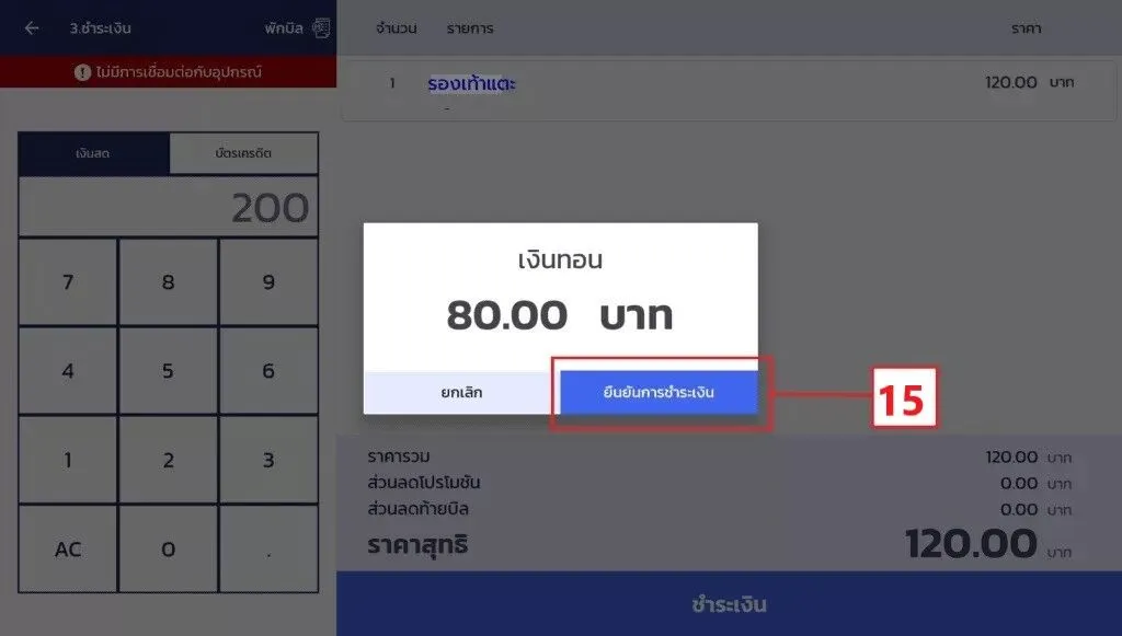 15. ระบบจะแสดงจำนวนเงินที่ต้องทอนลูกค้า จากนั้นกดปุ่ม “ยืนยันการชำระเงิน”