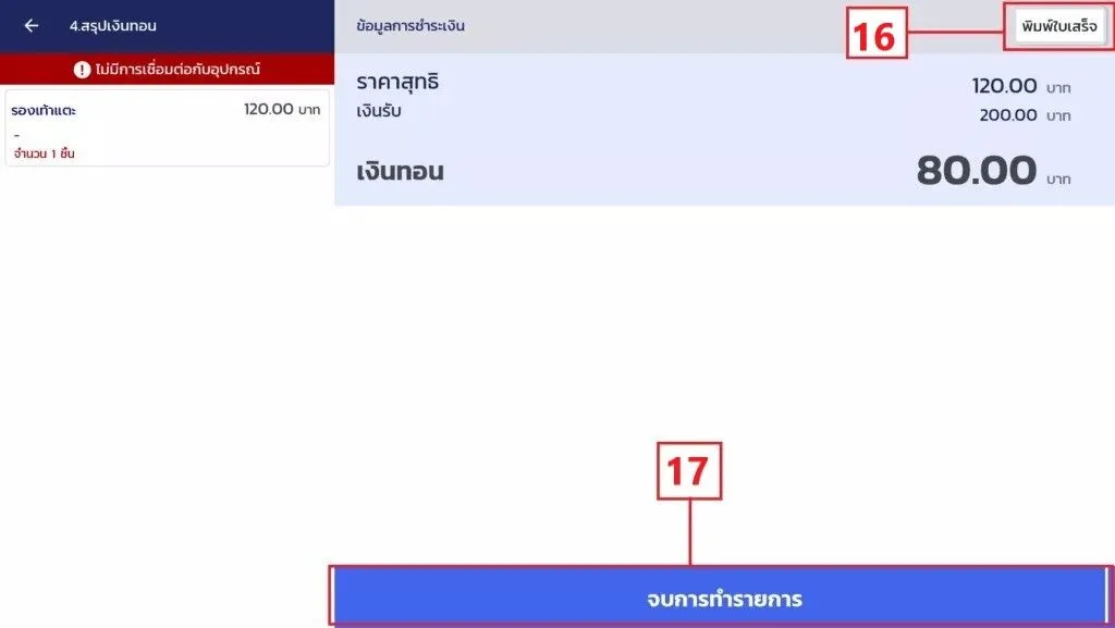 16. กดปุ่ม “พิมพ์ใบเสร็จ” เพื่อพิมพ์ใบเสร็จให้กับลูกค้า