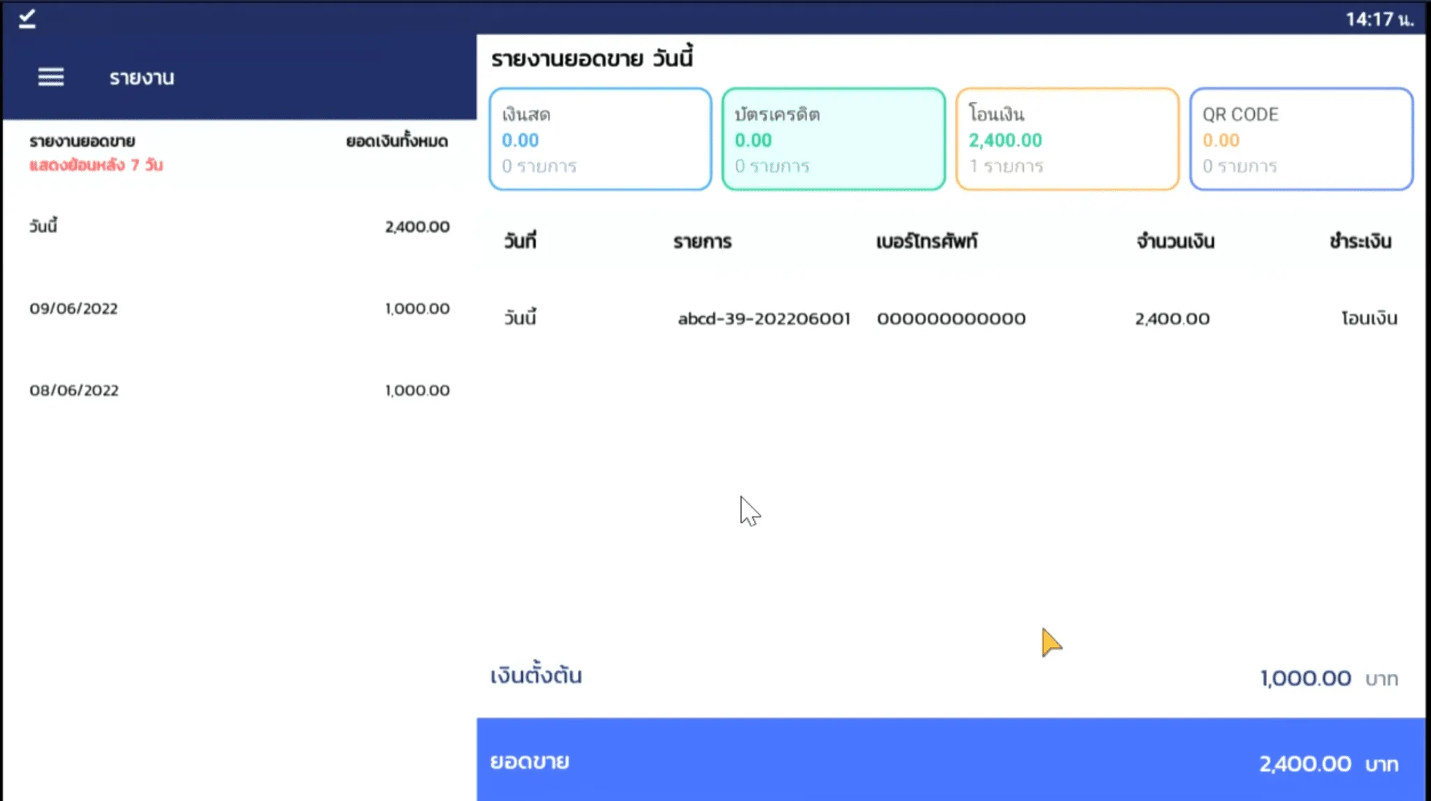 2. ตรวจสอบประวัติการขายย้อนหลังได้สูงสุด 7 วัน แยกยอดขายตามช่องทางการชำระเงินได้ ดังนี้