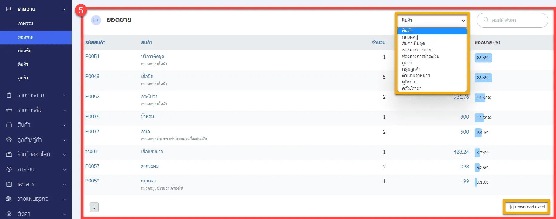 5. ยอดขายต่าง ๆ ซึ่งสามารถ Export Excel และเลือกดูข้อมูลได้ เช่น ยอดขายรายสินค้า ยอดขายรายหมวดหมู่ เป็นต้น