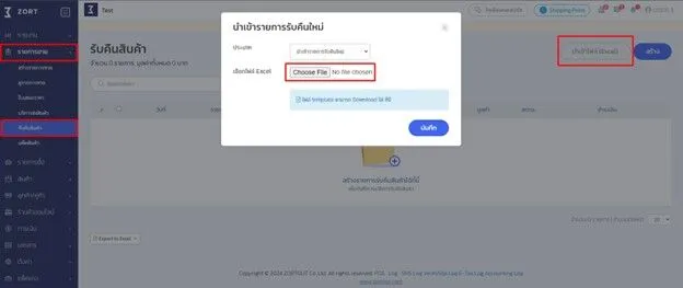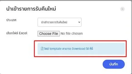 4. กรณีต้องการ Template ในการกรอกข้อมูลรายการรับคืนสินค้า ให้กดตรง “ไฟล์ template สามารถ Download ได้ ที่นี่” ระบบจะทำการ Download File Template ในการกรอกข้อมูลเพื่อนำเข้าระบบให้
