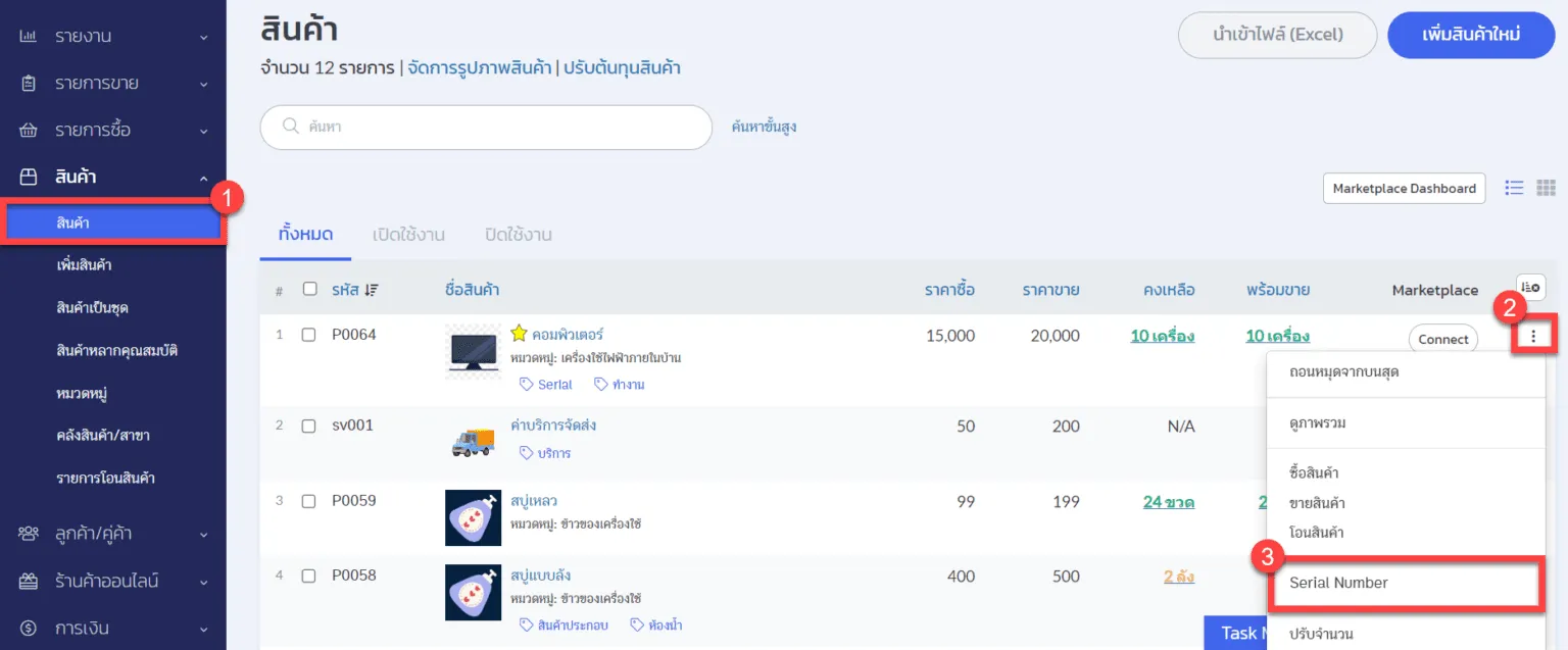2. กดคำสั่ง (จุดสามจุด) หลังรายการสินค้าที่ต้องการเพิ่ม Serial Number