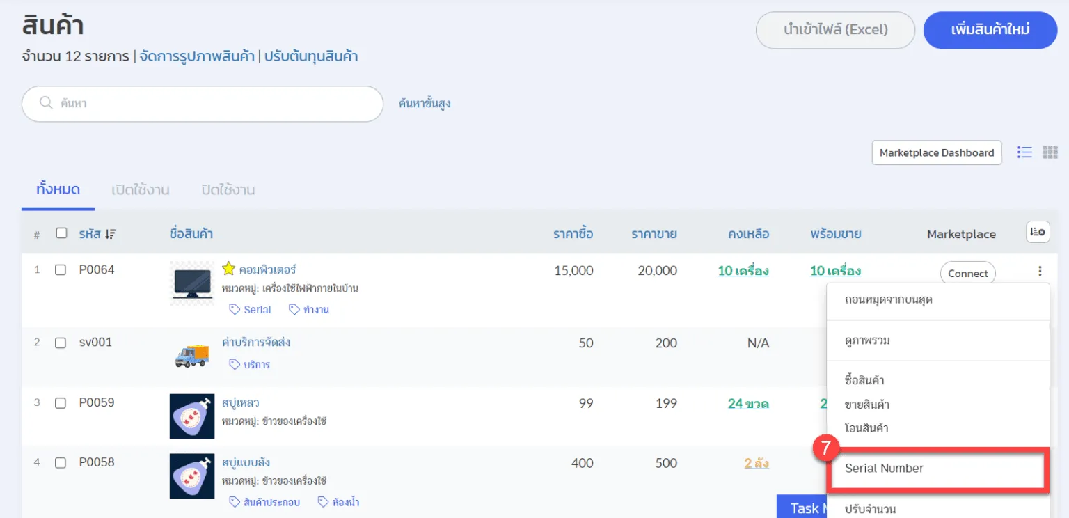 2. คลิกเมนู คำสั่ง (จุดสามจุด) หลังรายการสินค้าที่ต้องการเพิ่ม Serial Number