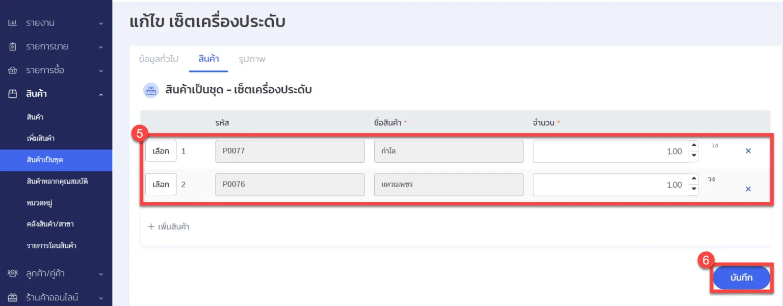 7. เมื่อสร้างสินค้าเรียบร้อย กลับมาที่เมนูสินค้าเป็นชุดอีกครั้ง